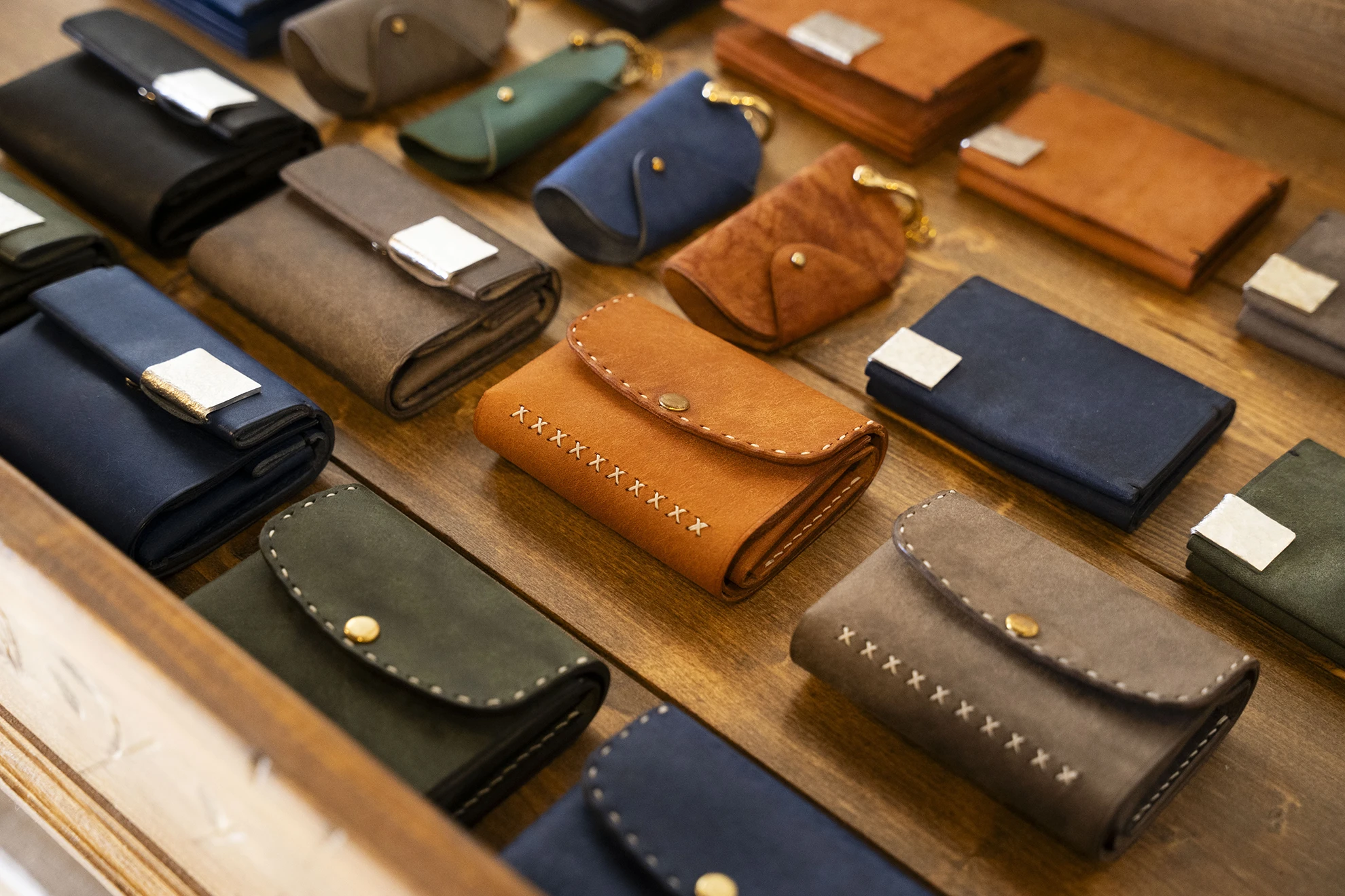 上質なイタリアンレザーを使い、錫(すず)をアクセントにあしらった革小物を、すべて手作りで仕立てている。